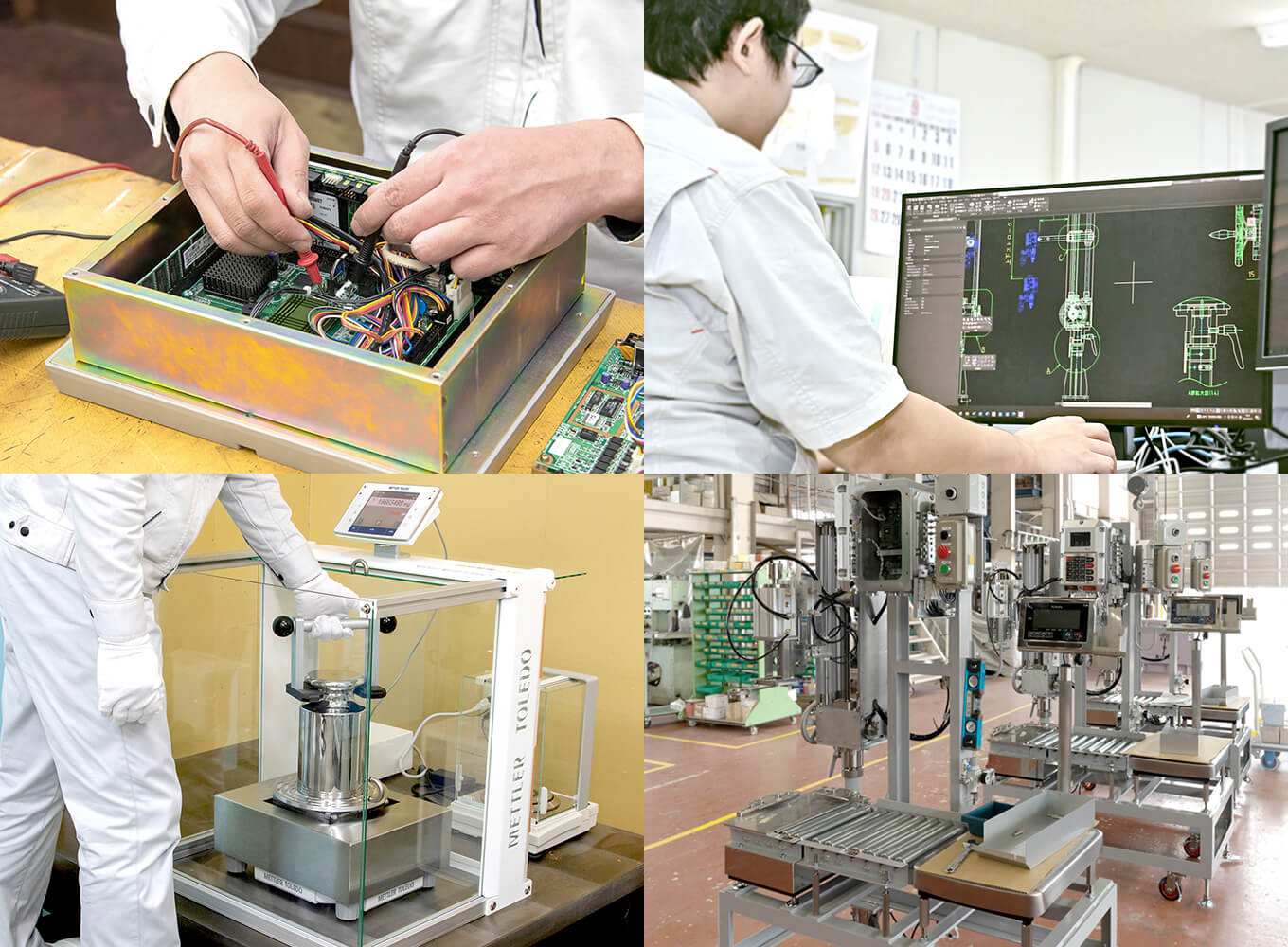 私たちは、創業時よりはかりの製造に携わり、計量器や圧力計などはかりに関する「設計・製造・販売・検査・修理」のすべてに対応できる一貫体制を確立しています。
